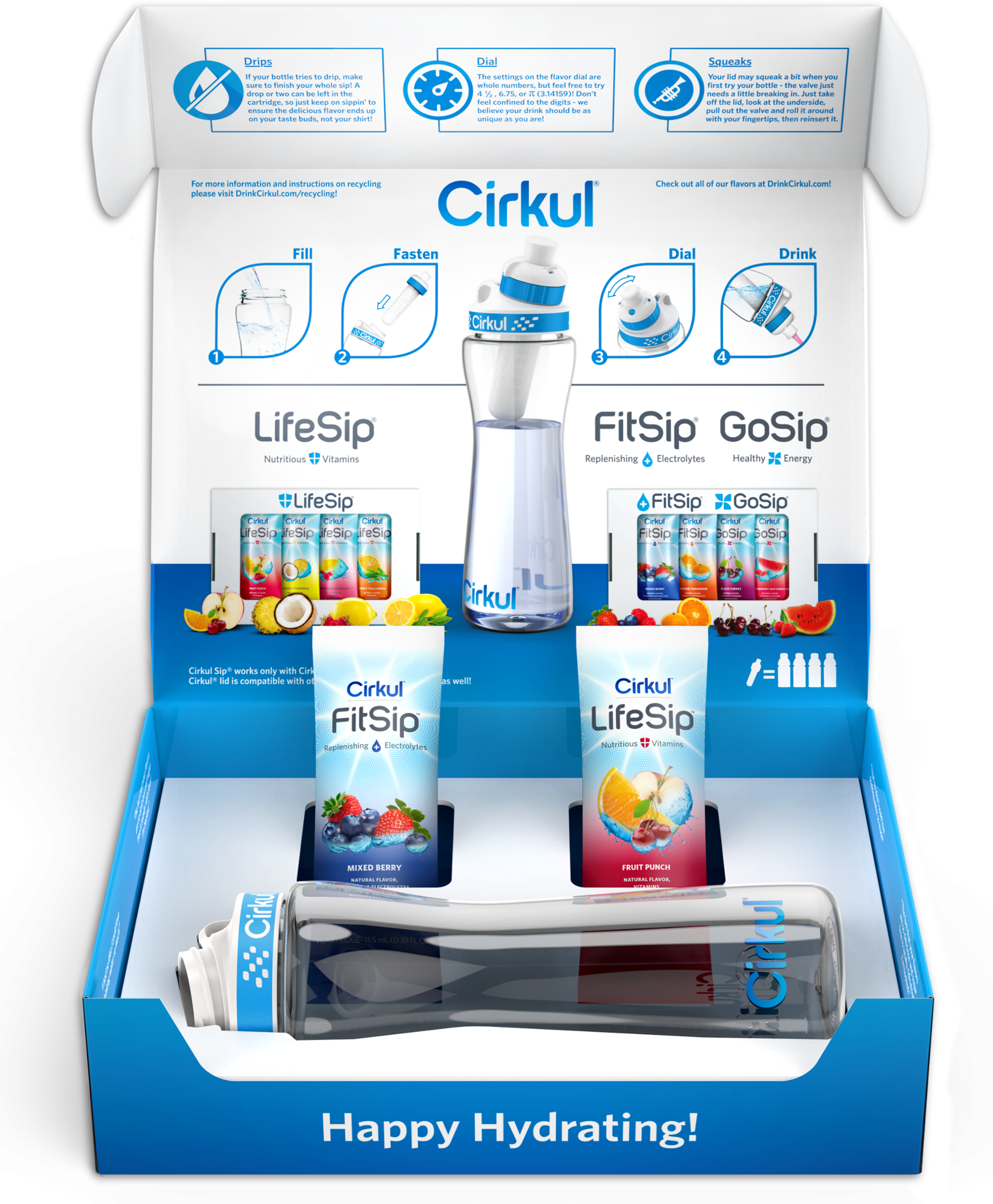 Ready to give Cirkul a spin? Our Starter Kit contains everything you need, including our dishwasher safe Cirkul bottle, leak-proof lid and two flavor cartridges (Fruit Punch and Mixed Berry). It��s the perfect way to stay happily hydrated. Perfect for gifts!